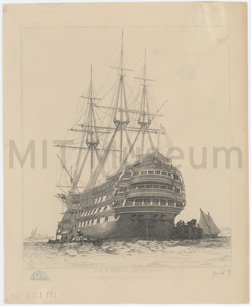 H. M. S. "Prince", First Rate, 110 Guns. Three-quarters stern view of the ship of the line "Prince", flying the …