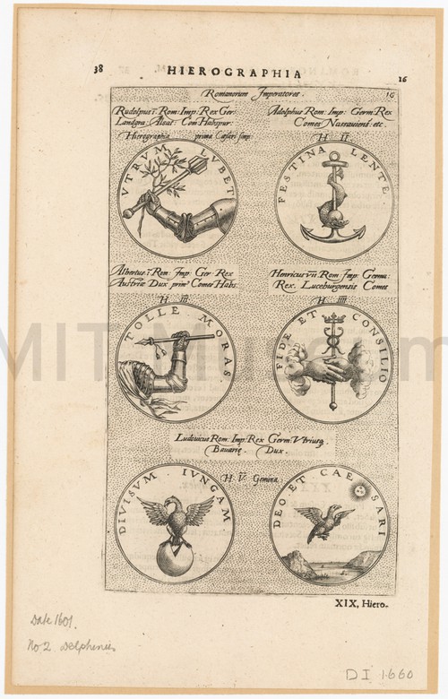 Hierographia - Romanorum Imperatores Uncolored engraving depicting six medals or seals, with caption text in Latin. …