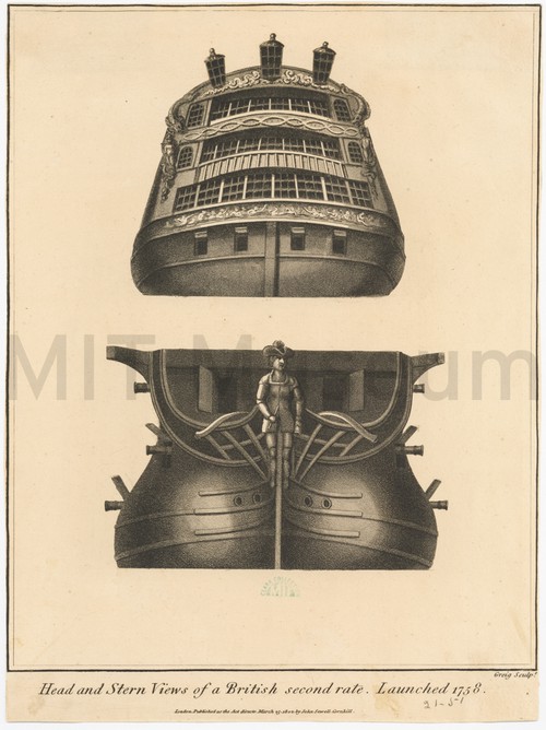 Head and Stern Views of a British second rate. Launched 1758. Uncolored etching with head (below) and stern (above) views of a ship, …