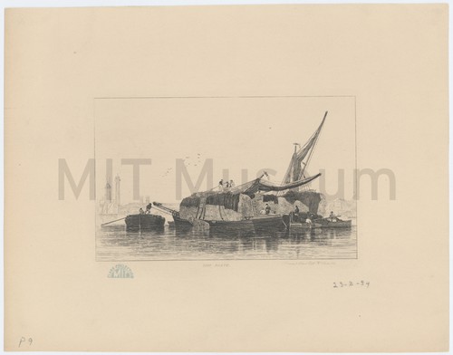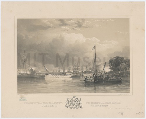 Her Majesty and Prince Albert, Proceeding in the State Barge, to land … Lithograph depicting the Royal Barge at Devonport, with spectators on boats in …