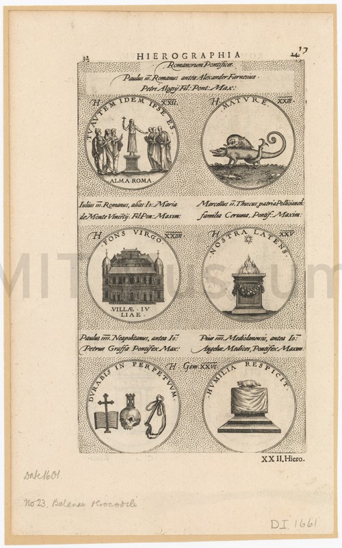 Hierographia - Romanorum Pontifices Uncolored engraving depicting six medals or seals, with caption text in Latin. …