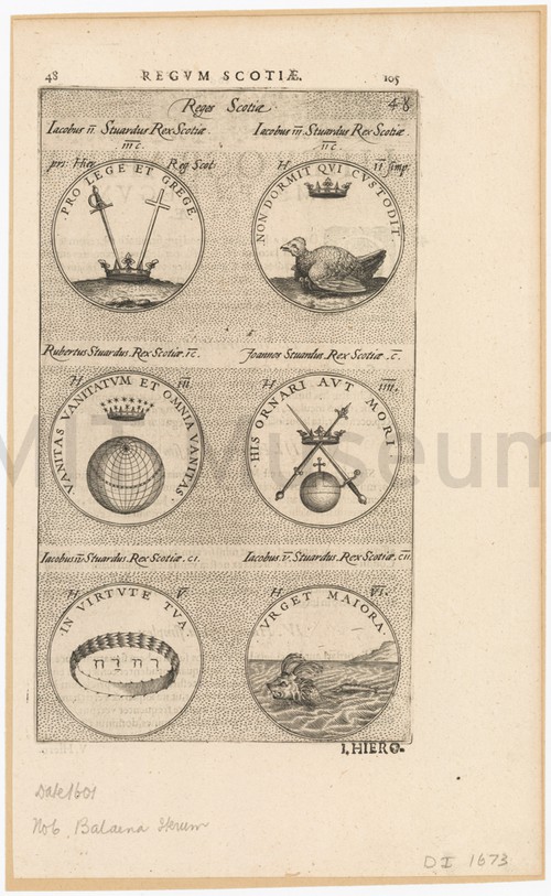 Hierographia (collection of 17) (Each depicting sheet containing picture with a whale) Uncolored engraving depicting six seals or medals. The bottom right medal has …