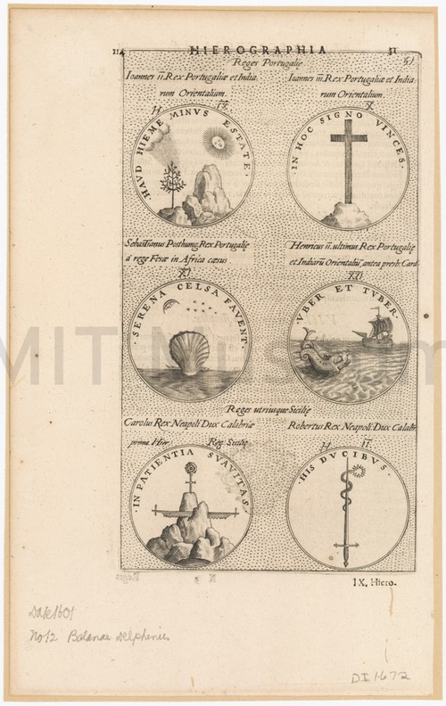 Hierographia - Reges Portugalie Uncolored engraving depicting six medals or seals, with caption text in Latin. …