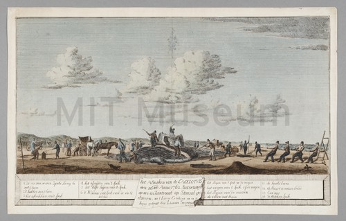 Het Afmaken van de Cagelotvis den 20 Feb. 1762 tussenwyk op zee … Hand-colored copperplate engraving depicting the cutting up of a beached whale, seen …