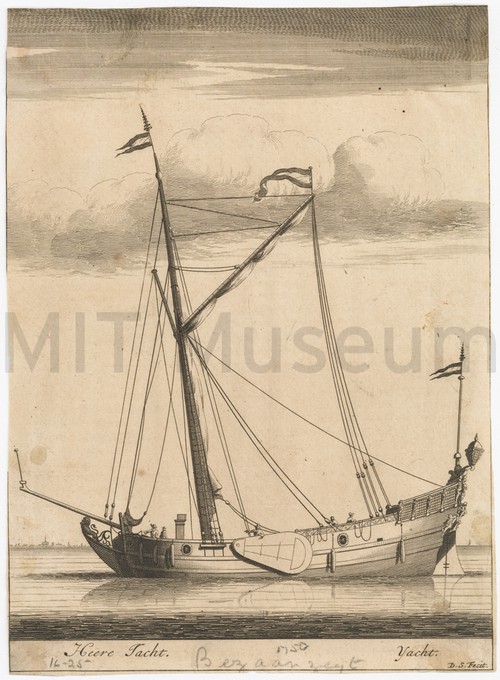 Heere Jacht. Uncolored engraving depicting a side view of a single-masted yacht with a …