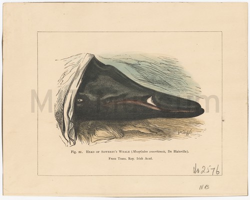 Head of Sowerby's Whale (Fig. 21.) (Mesoplodon Sowerbiensis, De Blainville) Hand-colored engraving of the head of a beached whale, facing right. The …