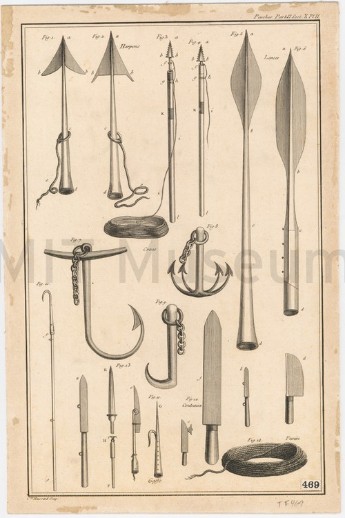 Harpoons, Lances, Knives etc. . Monochrome engraving depicting various implements used in whale fishery, including harpoons, lances, …