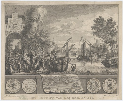 Het Ontzet van Leijden. Ao. 1574 Engraved scene of the relief of Leiden on 3 October 1574, during …