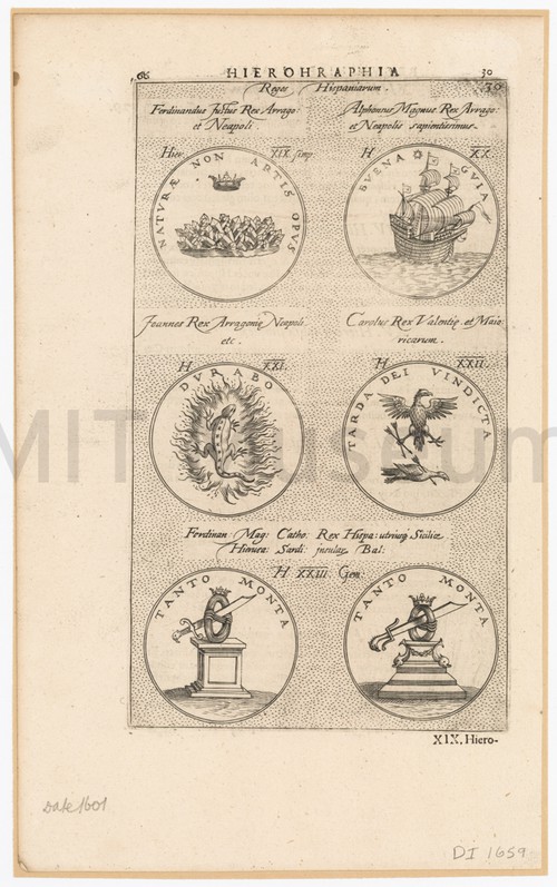 Hierographia - Reges Hispaniarum Uncolored engraving depicting six medals or seals, with caption text in Latin. …