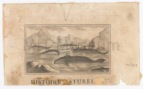 Histoire Naturelle Engraving of five whales spouting water and a narwhal. Mountains are depicted …