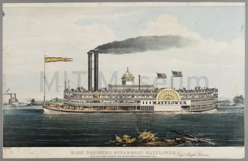 High Pressure Steamboat Mayflower Lithograph of steamboat Mayflower sailing to left. Two American flags flying from …