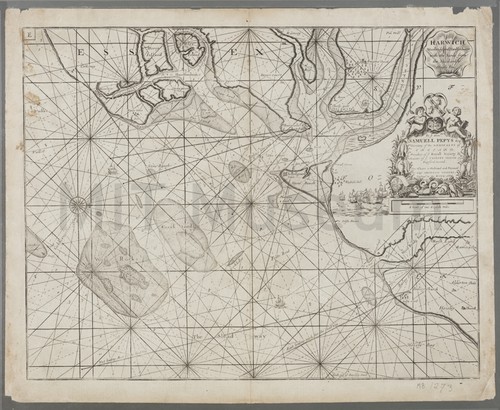 Harwich - Woodbridg and Handfordwater with the sands from the Hazeland to … uncolored chart, depicting an area near Harwich, dedicated to Samuell Pepys. Pepys …