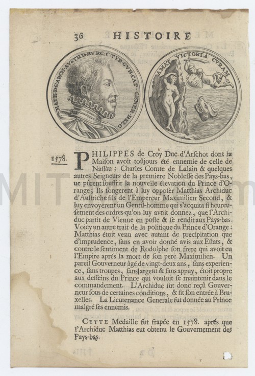 Histoire: Philippes de Croy, Duc d'Arschot Page from a book in French describing European medals. Pages 36, 37. …