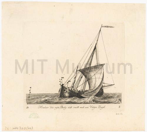 Hoeker hangende zyn zeylen te droogen Etching depicting a three-quarters bow view of a hoeker at sea, with …