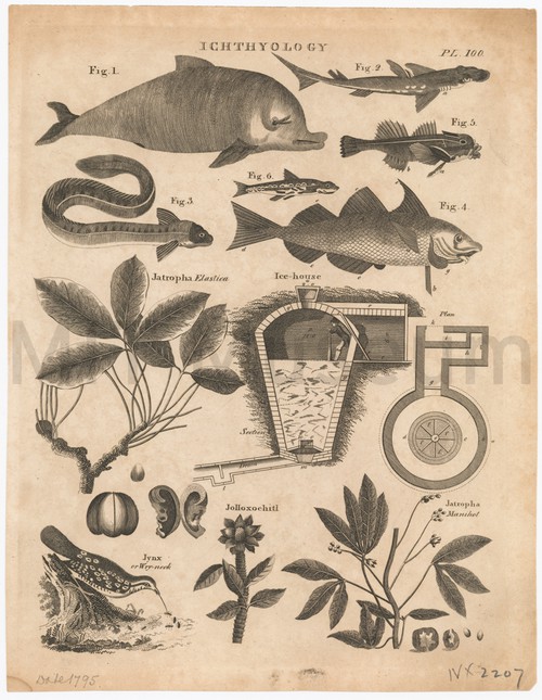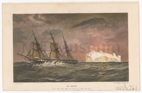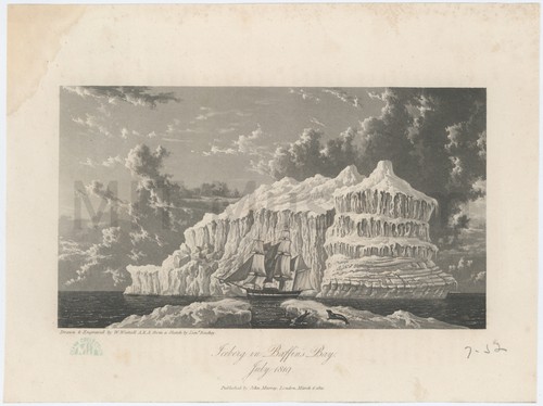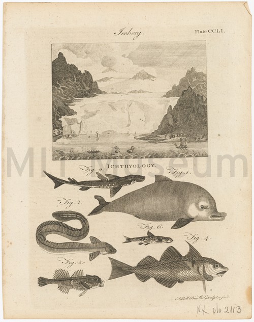 Iceberg and Ichthyology Monochrome plate from a book (Plate CCLI) featuring, top, a landscape with …