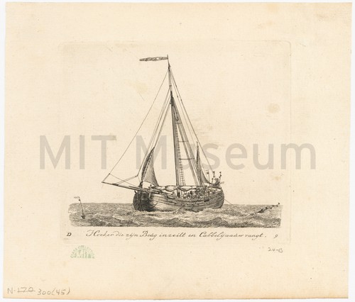 Hoeker die zijn Beug inzeilt en Cabbelyaauw vangt. Etching depicting a three-quarters bow view of a cod-fishing vessel at sea. …