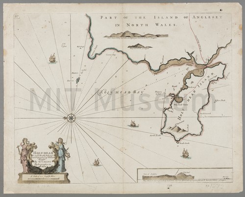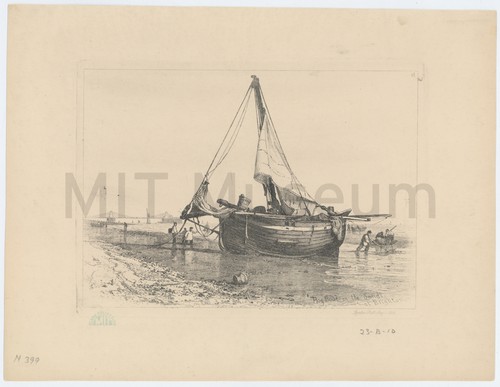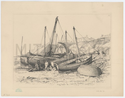Hog-boat on the sands at Brighton Side view of a single-masted vessel on the shoreline, with men standing …