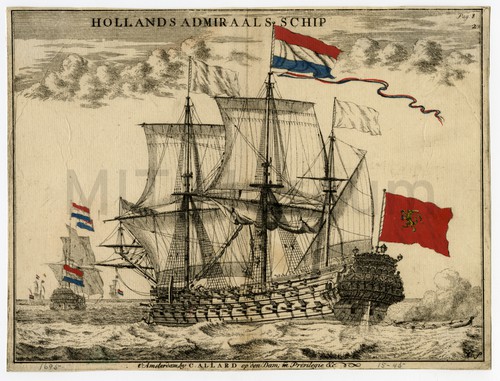Hollands Admiraals Schip Engraving depicting a Dutch admiralty ship in three-quarters view, stern towards the …
