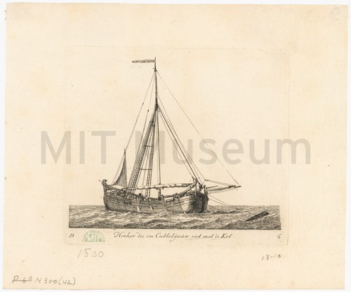 Hoeker die om Cabbelyauw vist met de Kol. Etching depicting a three quarters bow view of a single-masted hoeker at …