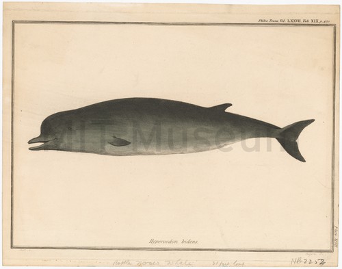 Hyperoodon Bidens Hand-colored image depicting a bottlenose whale, side view. Titled below, "Hyperoodon bidens." …