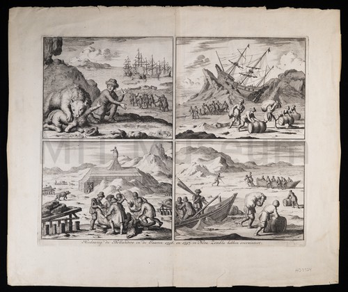 Hoedaanig de Hollanders in de Jaaren 1596, en 1597, in Nova Zembla … Set of four images showing scenes from Gerrit de Veer's account of …