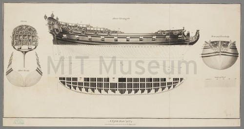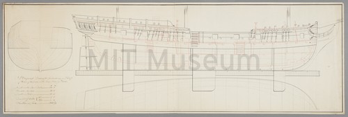 A Proposed Draught for building a Sloop of War of 16 Guns, … Original draft of three figures drawn in red, black, and green. Includes …