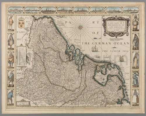 A New Mape of ye XVII Provinces of Low Germanie Hand-colored, west-oriented map of the provinces of the Low Countries from John …