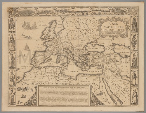 A New Mappe of the Romane Empire Uncolored map illustrating the history of the ancient Roman Empire from a …