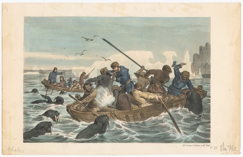 A Fight with the Walruses - Young Lord Nelson Commanding the Relieving … Colored engraving of a rowboat with 8 men defending themselves with oars, …