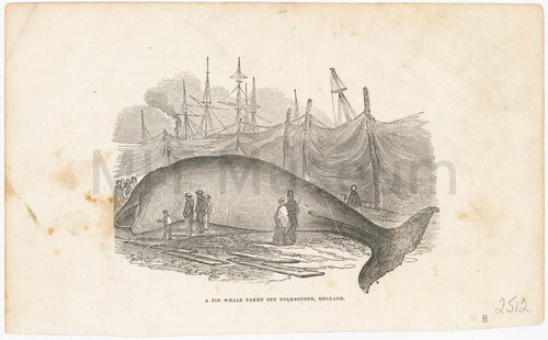 A Fin Whale taken off Folkestone, England Monochrome print showing a beached whale, with several men and women around …