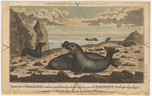 A Sea Lion when suddenly disturbed. A Lioness asleep by him and … Colored engraving depicting an aggrieved sea lion, bearing his teeth, with a …
