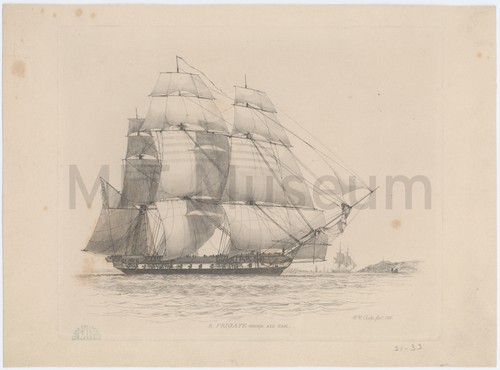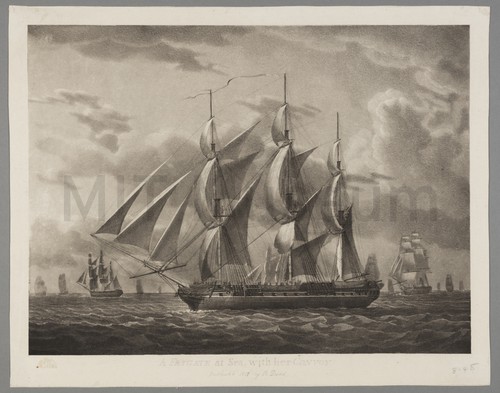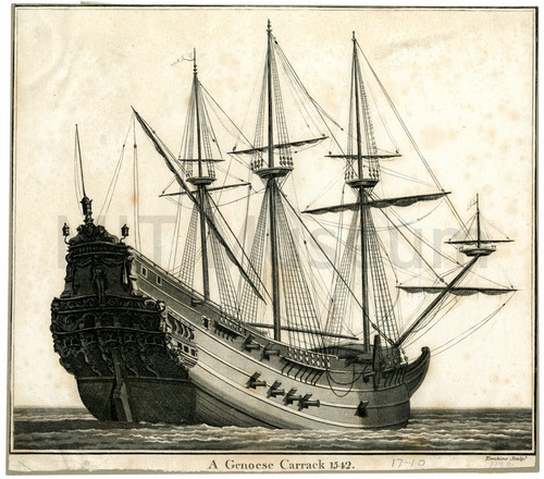 A Genoese Carrack 1542. Uncolored aquatint depicting a three-quarters stern view of a gunship with three …