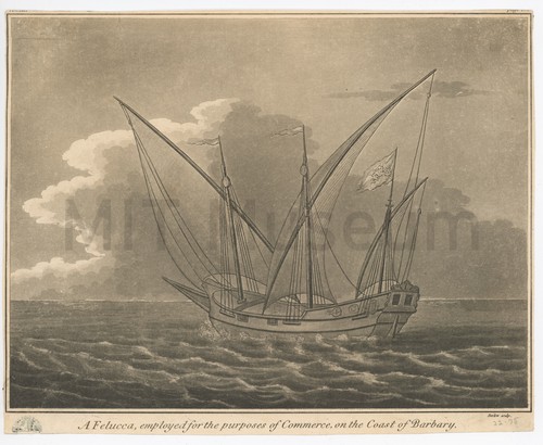 A Felucca, employed for the purposes of Commerce, on the Coast of … Engraving of a felucca, a small and wooden vessel propelled by lateen …