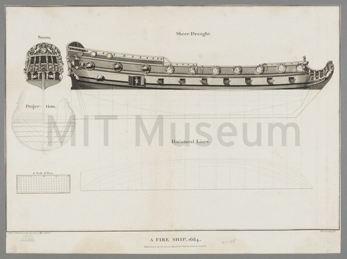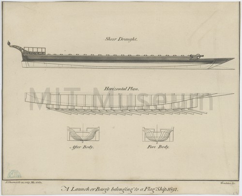 A Launch of Barge belonging to a Flag Ship. 1692 Sheer draught, horizontal plan, afterbody, and forebody views of a typical launch …