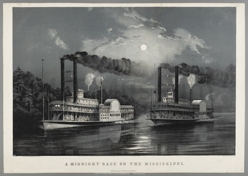 A Midnight Race on the Mississippi Lithograph depicting a race between steamboats Natchez and Eclipse.