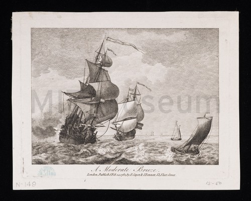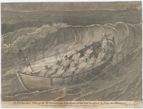A Perspective View of Mr. H. Greatheads Life-Boat, going out to assist … View of a lifeboat with five pairs of rowers on a choppy …