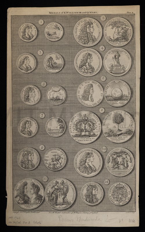 Medals of King WIlliam III and Q. Mary Plate II. Engraving from Tindal's Continuation of Rapin's "History of England", showing 12 medals, …