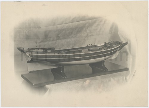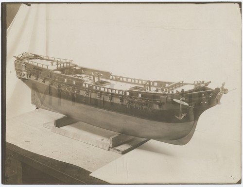 Model of an English East Indiaman Photograph depicting a model ship in three-quarters bow view, without rigging or …