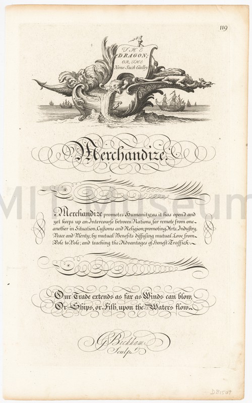Merchandize/ The Dragon or None Such Galley Uncolored engraved sheet with English text extolling the virtues of "Merchandize" (Merchandise?). …