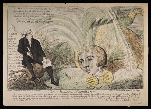 Modern Leviathan Hand-colored political cartoon depicting a large, golden whale with a human head …