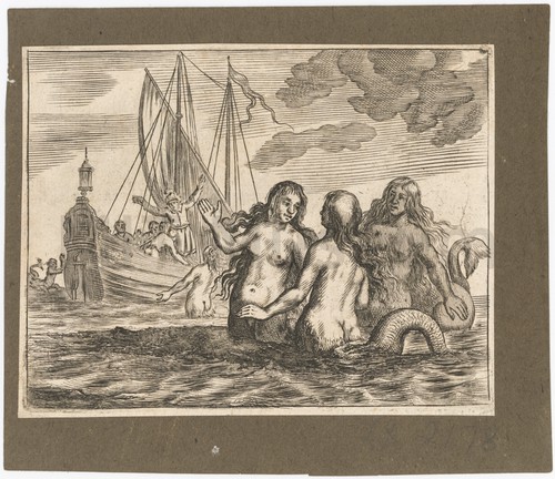 Mermaids Monochrome image showing three mermaids in the water, at right, and in …