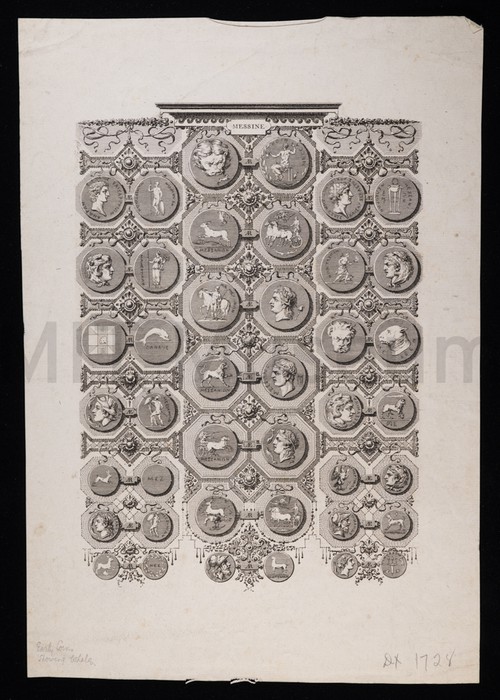 Messine Uncolored engraving depicting both sides of a selection of Classical coins, some …