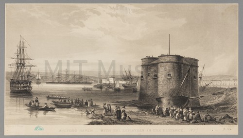 Milford Haven with the Leviathan in the Distance A view of a shore in Milford Haven with the 'Leviathan,' or …
