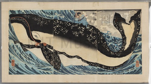 Miyamoto Musashi plunging his sword into a giant whale woodblock print tryptich. Illustration of a Japanese legend, Miyamoto Musashi (1582-1645) killing …