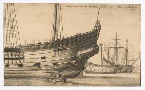 Naves Mercatoriae Hollandicae per Indias Occidentales Ships of various shapes and forms. Sailors depicted managing the ship. Inscription …