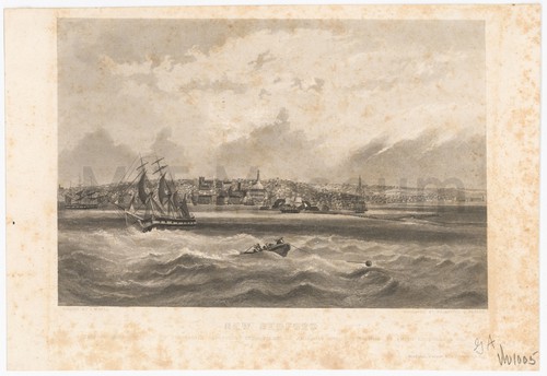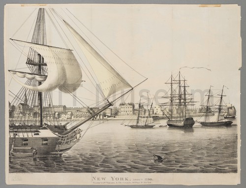 New Bedford Whalers at their Wharves Faded photograph depicting three New Bedford whaling ships at a port, looking …