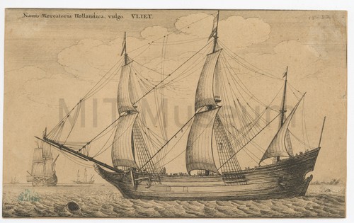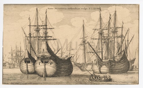 Naves Mercatoriae Hollandicae, Vulgo Ulieten A dinghy approaching two Dutch flutes, anchored in foreground at left; two …