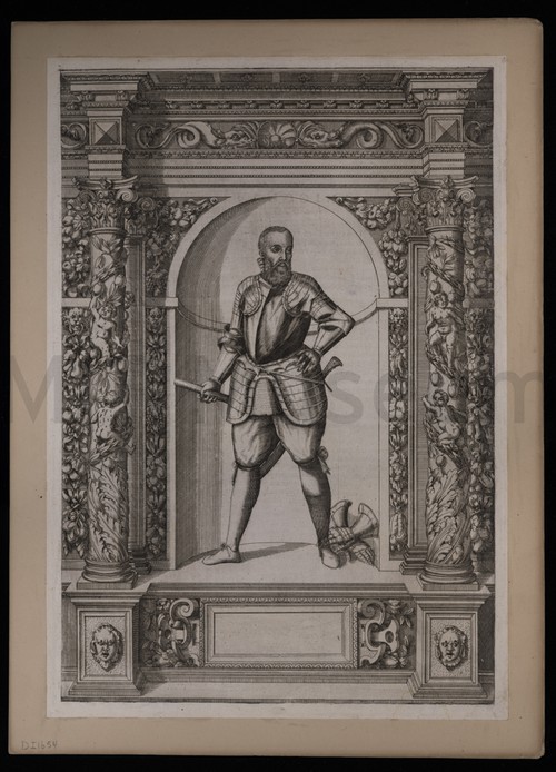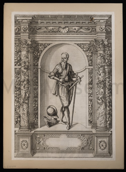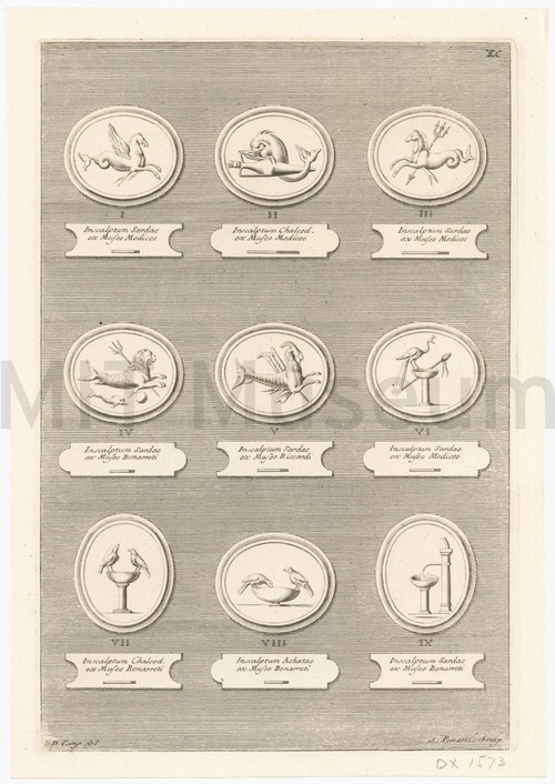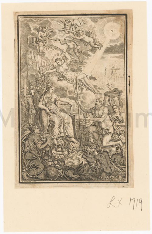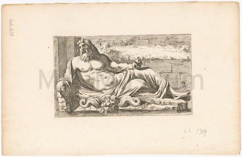 Neptunus in Capitolo Uncolored copperplate engraving depicting a statue in Rome of Neptune reposing by …