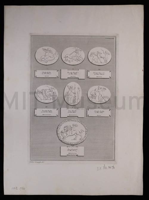Plate LXXVIII Print depicting seven Roman seals or emblems on a striped ground, with …