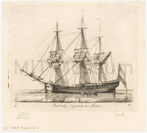 Pink schip leggende ten Anker Etching depicting a side view of a pink (a type of small …
